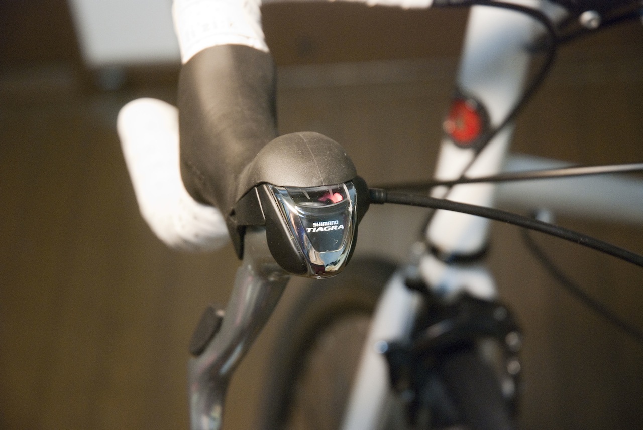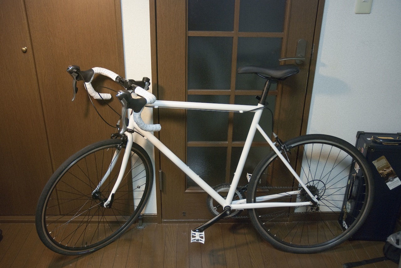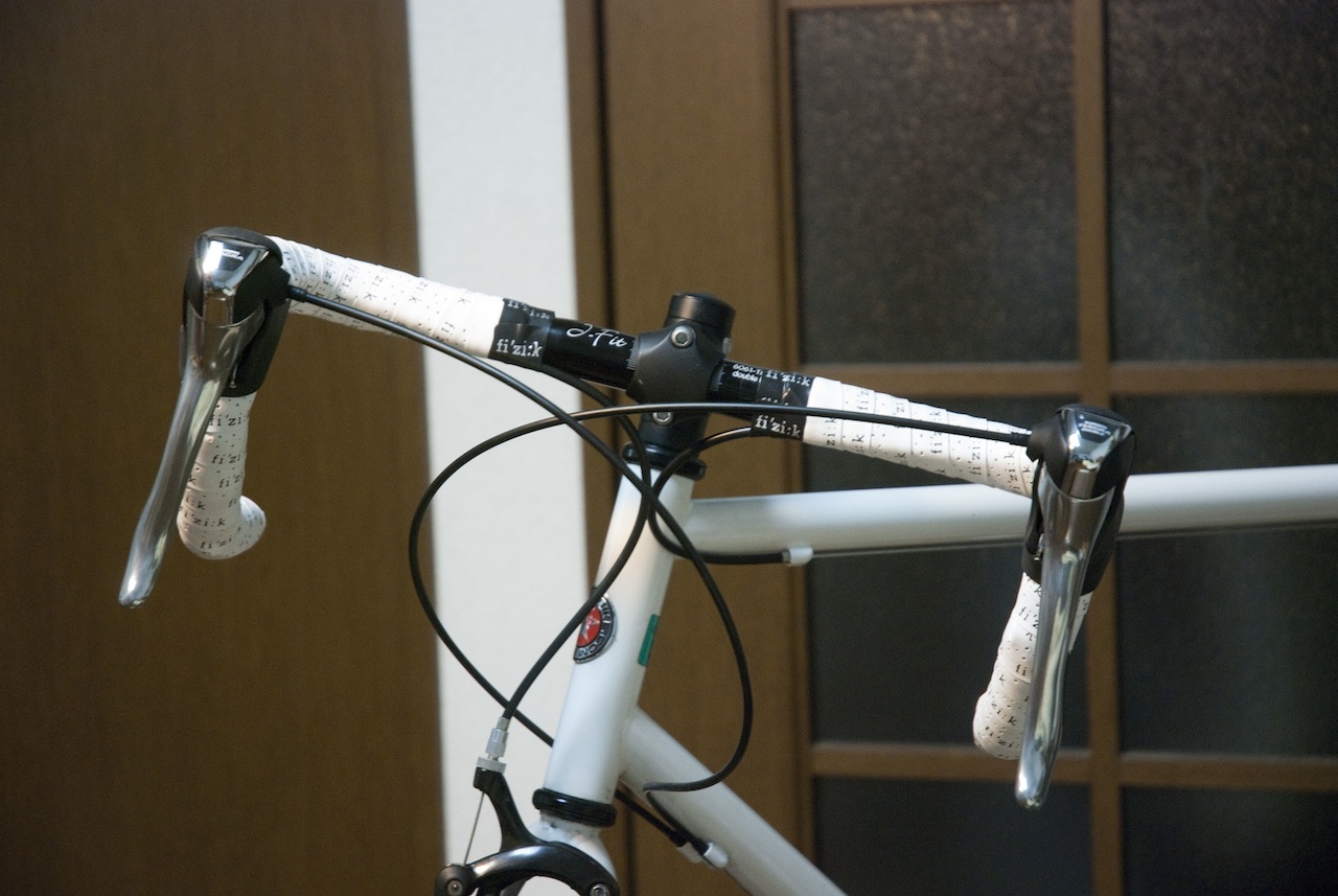 今回の記事は写真いっぱいですよー。 詳細は以下から。 上の写真はお遊びです。ホワイトバランス弄っただけ。 さて、念願のTokyobike Sport 9sのドロップハンドル化を完了しました。 ご覧の通り、バッチリです。 使用したハンドルは前回書いた通り、Dixnaのジェイフィット 380mm (C-C)です。 標準サイズといえる400mmでも良かったんですが少し小さめの方がしっくりくるかな、と。 作業中の写真です。 このハンドルは4000円未満と安価ですが、必要十分。結構軽い割にしっかりしてます。 ちなみによく見るとお分かりいただけますが改造にあたって前ギアやらペダルやらチェーンやら全部外してあります。 TiagraのSTIレバー。オークションで新品を15000円程で手に入れました。 定価より5000円以上、ネットで買うより3000円以上予算浮きましたw バーテープ巻くのも初めてでしたが結構きれい?に仕上がりました。 ご覧になられればお分かりかと思いますがステムはスペーサー一個(1cm)分下げてみました。 これでよりドロップの恩恵(エアロ効果)に肖れそうです。 Fiz:k(フィジーク)のロゴ入りバーテープがかっこいいでしょ? 全体像です。ドロップ化するだけでずいぶんロードバイクっぽくなりましたね! ちなみにサドルももう少し上げて、ハンドルもスペーサ2個分下げる余地があるので やろうと思えばかなりレーシーなポジションもいけそうです。 まぁ暫くはこのハンドルに慣れる、という意味でこのぐらいのセッティングで行こうかな、と。 あ、そうそう。浮いたお金でペダルも買いました。 と言っても町乗り用の両踏みペダルなんですけど。 WellgoのR119。色は車体に合わせてホワイト。 今までのペダルが片踏みでちょっと大柄だったので。 小柄な感じがマッチしてていいですが性能はいまいちです。 摺動が良くない.... まぁペダルは比較的簡単に交換が出来るのでまた考えてみます。 以上、Tokyobikeドロップ化計画のレポートでした。 記事の最後までおつきあいいただいてありがとうございますー。 よろしければぜひコメントをお願いします。 【追記】 今回かかった費用は工具、ペダルなども送料含めて約26000円でした。 もしかしたら今冬中にクランクセットも交換するかもです。 PR