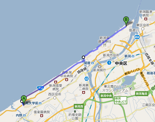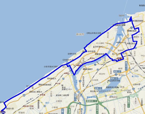 2ヶ月程前に前ハンドルをドロップ化したiiyamalineの 今回はもう一度調整し直した結果、ほぼバッチリです。 さて、それでは今回のルートをば。 走行距離 41.8km 平均速度 28.8km/h(走行中) まだたったの42kmですが、自分にとってはちょうどいい感じです。 今回はとりあえず新潟みなとトンネル(海底トンネル) みなとトンネルをくぐるのは初めてだったので、 駅に行くのに軽く迷いました。 この辺り、迷走感が出てますよね。 方角的に合ってると思って曲がったら北越製紙のど真ん中を突っ切 その語新潟駅で落研の公演をみて、 落研の公演にてとりなまず氏発見。広報の取材かと思ったら今回はプライベートだそうで。 途中雨が降り出して焦りましたが、 帰り道、いつもだったらバテてしまっていて、26km/ 基本的に30+km/hぐらいで巡航してたのですが、 フラットペダルなのでまぁこんなもんでしょうか。 行きのシーサイドラインと、 行きの時に出会った方は女性(追越し)で、帰りは男性の方(すれ違い)。レーサーパンツかっこいいなぁ。まぁ今のいいやまらいんが着ても変態にしかなりませんが。 どうでもいいですが、 なんだかすごく仲間感がしていいです。 自転車に乗る楽しさや、自分の限界に挑戦する大変さや、 自分もなるべく挨拶はするようにしてますが、 青いウィンドブレーカで白いクロモリの自転車に乗ってる野郎に無 それと何だか今日は自転車とより強くつながれた気がしました。 速度を落としたくないときに、すこしグッと踏み込む。 もっと先に行ける。 もう少し速く漕げる。 そういう感じがしました。帰りにシーサイドラインから抜ける時、 「ああ、もう終わりか、もう少しこのまま走っていたいな」 と思いました。 走らなかったのは明日スキーに行くからなんですが。 なにか「もっと先に。」と思った1日でした。 そのために、今の自分 ― まだまだ貧弱な身体、ジャージのズボン、ウィンドブレーカー、 をちょっとずつ、変えていきたいと思います。 さて、ではお風呂に入って疲れを癒して、明日のスキーのためにワックスをぬってきます。 ではまた。 PR