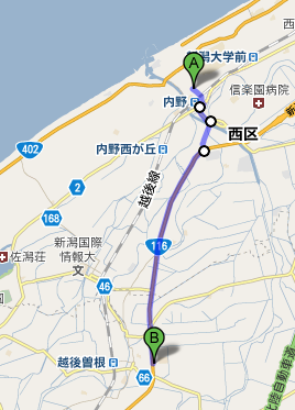 ということで雪解けを待たずしてとりあえず走ってみたのである。 まぁいつ降るともしれないどんより鈍色天気、冬の寒い気温に日本海からの北風が容赦なく吹き付けるという最悪コンディションでしたが、それよりも走りたい気持ちの方が優先でした。 結果的に、サイクリングロードはぽつぽつも雪がありつつも走れる状況でした。 一部路面がでこぼこしててロードバイクには危ないところも。改善要求! 上の地図のBの位置からは雪がまだ路面いっぱいに残っていたので引き返してきました。 走行距離 31.66km 平均速度 16.7km/h 下見がてら、ちょくちょく止まっていたのでこんなもんです。 これだけ正確に走行距離が出るのは秘密兵器を入手したからなのですが... まぁそれはまたおいおい。 |